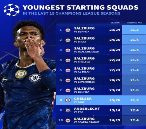 北京时间10月23日,切尔西在欧冠联赛阶段第3轮的比赛中主场5-1大胜10人作战的阿贾克斯,吉乌、莫伊塞斯-凯塞多、恩佐-费尔南德斯、埃斯特旺以及泰里克-乔治分别进球。赛后根据德转的统计,切尔西本场比赛首发阵容的平均年龄仅为21.6岁,为欧冠近15个赛季第8年轻。