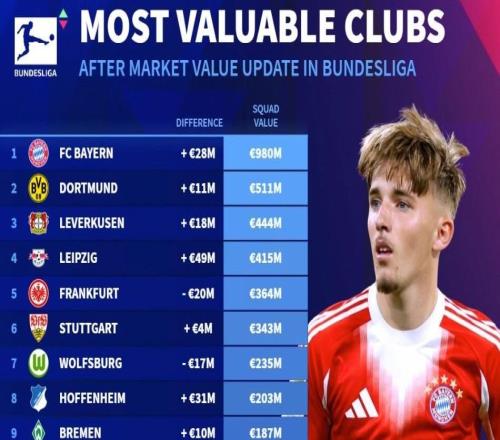 • 德甲俱乐部身价榜:拜仁9.8亿欧断档领先,海登海姆5380万最低